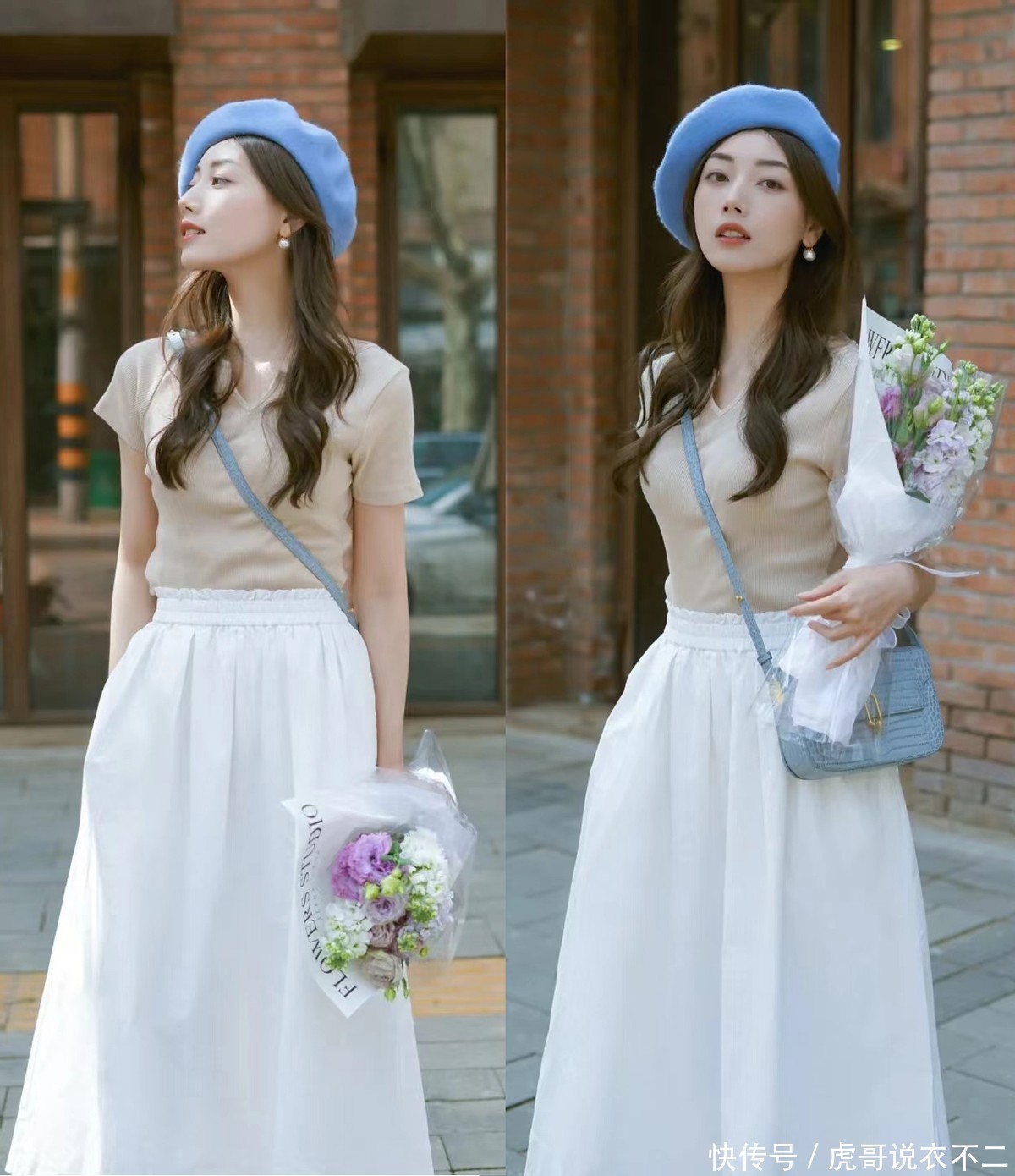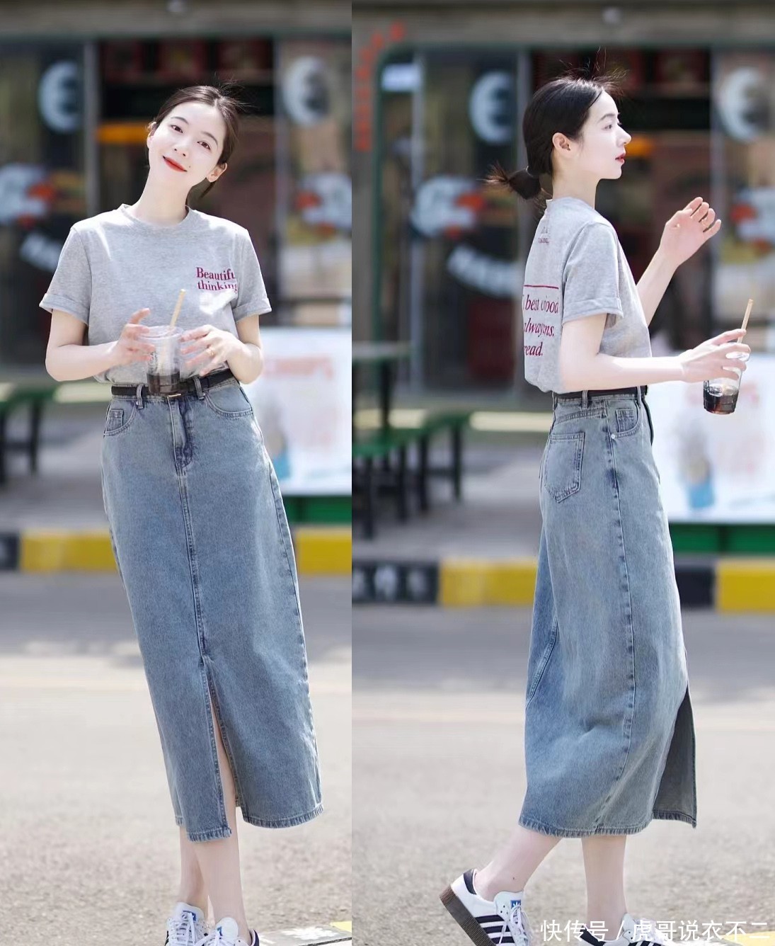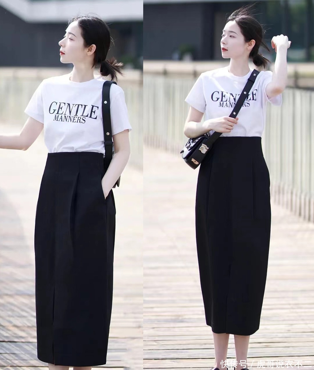 二、T恤+半身裙频年来诚然更流行oversize的T恤,但仍是提议世界衣着修身样式,一是显得造型利落,二是容易与下装穿出“上短下长”的嗅觉,更显高显瘦。