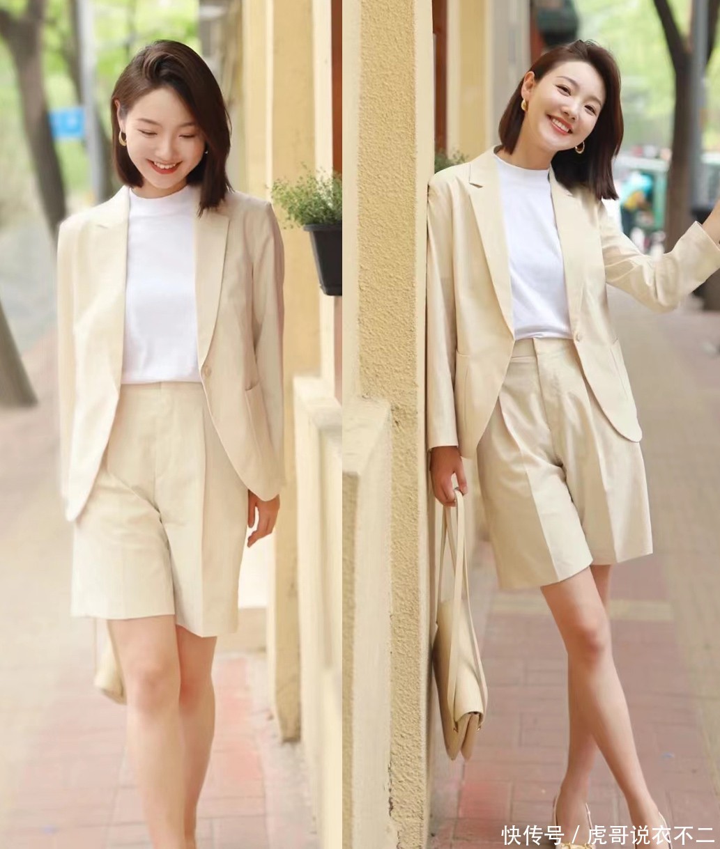 三、小西装+五分裤当前小西装早已不是专属于职场的单品,好多女性在闲居造型中,也可爱利用小西装秀出前锋姿态。