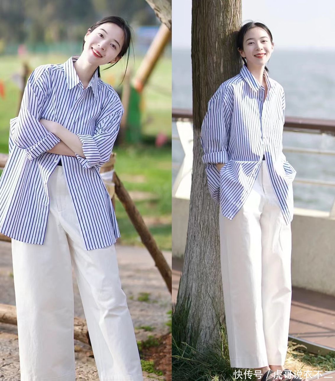 上图这身亦然帅气风相比隆起的穿搭,而比起饱和度略高的牛仔布,这种蓝色条纹的策画,看起来要愈加干净亮丽。最要害的是竖条纹还不错拉伸纵向线条,即使是相比宽大的衬衫样式,也不会显得上半身很寂静。