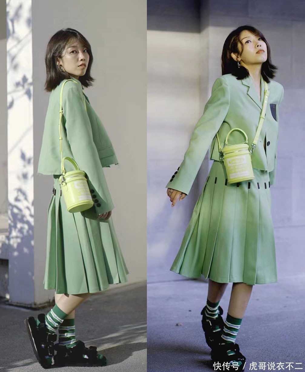 绿色的气派底色是崭新的,因此也不会有太过于鲜亮的嗅觉,即使像图中这位女士一样,收受同色系的着装,也能彰显出相比优雅俏丽的一面。
